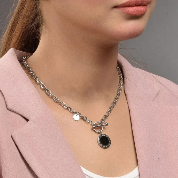 The Chains-0047 collection features necklaces with sleek, elongated bar pendants. Available in silver-toned, gold-toned, and rose gold-toned metals, some with a black…