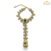 Design: Traditional ornament featuring a jeweled bracelet band connected to a finger ring by a central chain adorned with floral motifs and pearl clusters. Includes prominent central square emerald-toned jewels on the wrist and ring.