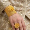 This exquisite ensemble is the perfect choice for making a majestic and unforgettable entrance at any shadi or grand celebration. Furthermore, the cohesive floral motif across the wide cuff and the matching adjustable ring ensures a unified, opulent, and commanding presence. Therefore, the Dimensional Meshwork Bangle Ring Set is a must-have for a collection dedicated to extraordinary traditional artistry and structural grandeur.
