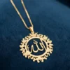 - Design: Circular pendant featuring intricate calligraphy (as depicted in the image, likely “Allah“) surrounded by a detailed, wreath-like or crowned border, suspended from a delicate chain.
