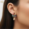 Design: Ornate drop earrings featuring a central multi-petaled blossom motif encrusted with vibrant-toned, precisely cut stones, suspending a detailed gold-tone cage drop.