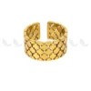 The Circlet Ring have a wide, textured design. For this reason, they are made from polished golden stainless steel. The piece has a connected, block-like form that creates a woven look. As a result, it is a very modern and strong accessory.