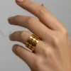 The Continuum Ring has an endless and flowing design. For this reason, they are crafted from polished golden stainless steel. The piece has a linked, mesh-like form that creates a strong and continuous look. As a result, it is a very modern and stylish item.